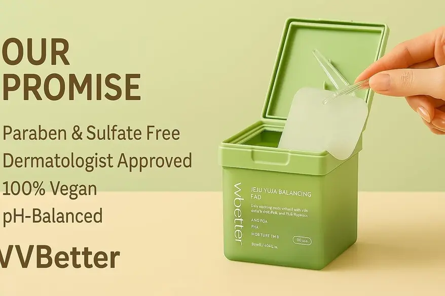 Advanced Korean Skincare for Brightening, Hydration & Sebum Control. Experience daily soothing, brightening, and refining care with VVBETTER Jeju Yuja Balancing Pads. Infused with Jeju Yuja Extract, Zinc PCA, and PHA, these large daily toner pads help soothe, exfoliate, and hydrate your skin while controlling excess oil for a balanced complexion.